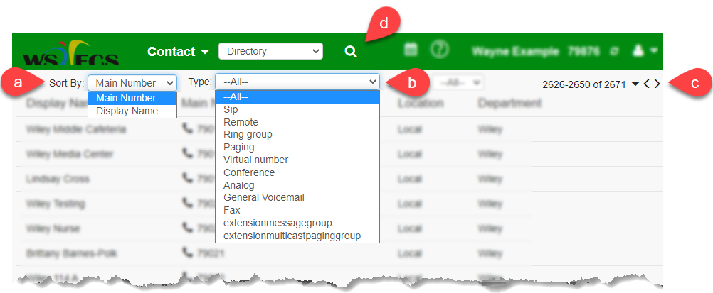d. Clicking on the Search button will allow you to search in the Display Name or Main Number fields.