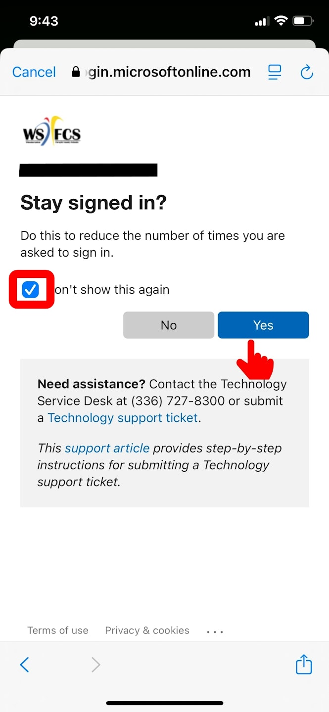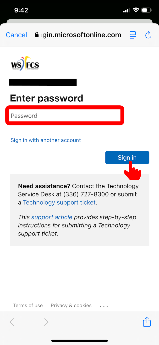 If you cancel out of these popups, you will eventually get a prompt to sign in with your WSFCS email address already populated and a password field. Do not enter your email password here, as this will attempt to sign you in through Apple's servers, and your account is authenticated against Microsoft.
