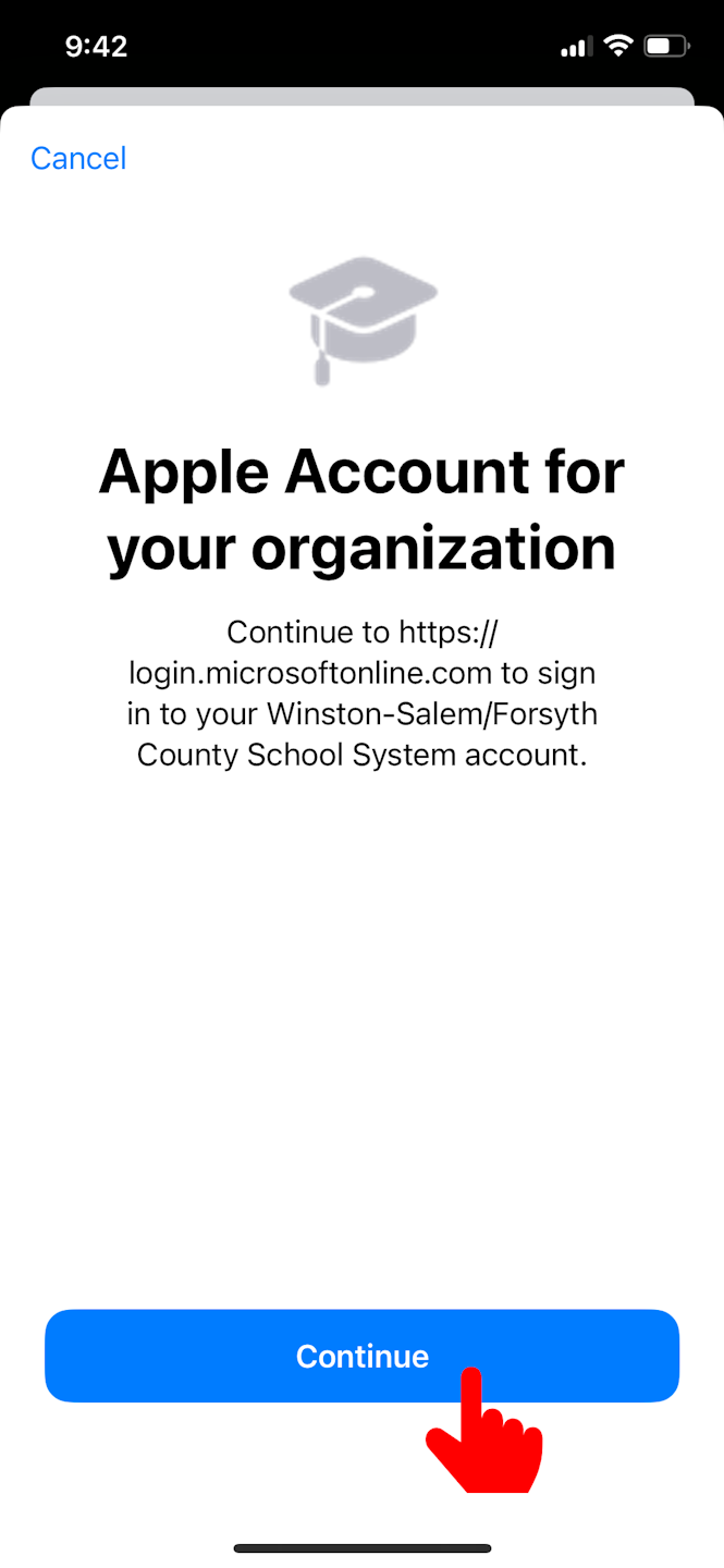 You will be prompted with an "Apple Account for your organization" window. Continue through that prompt to complete the sign-in process. You will see a Microsoft login window and be asked for your email password.