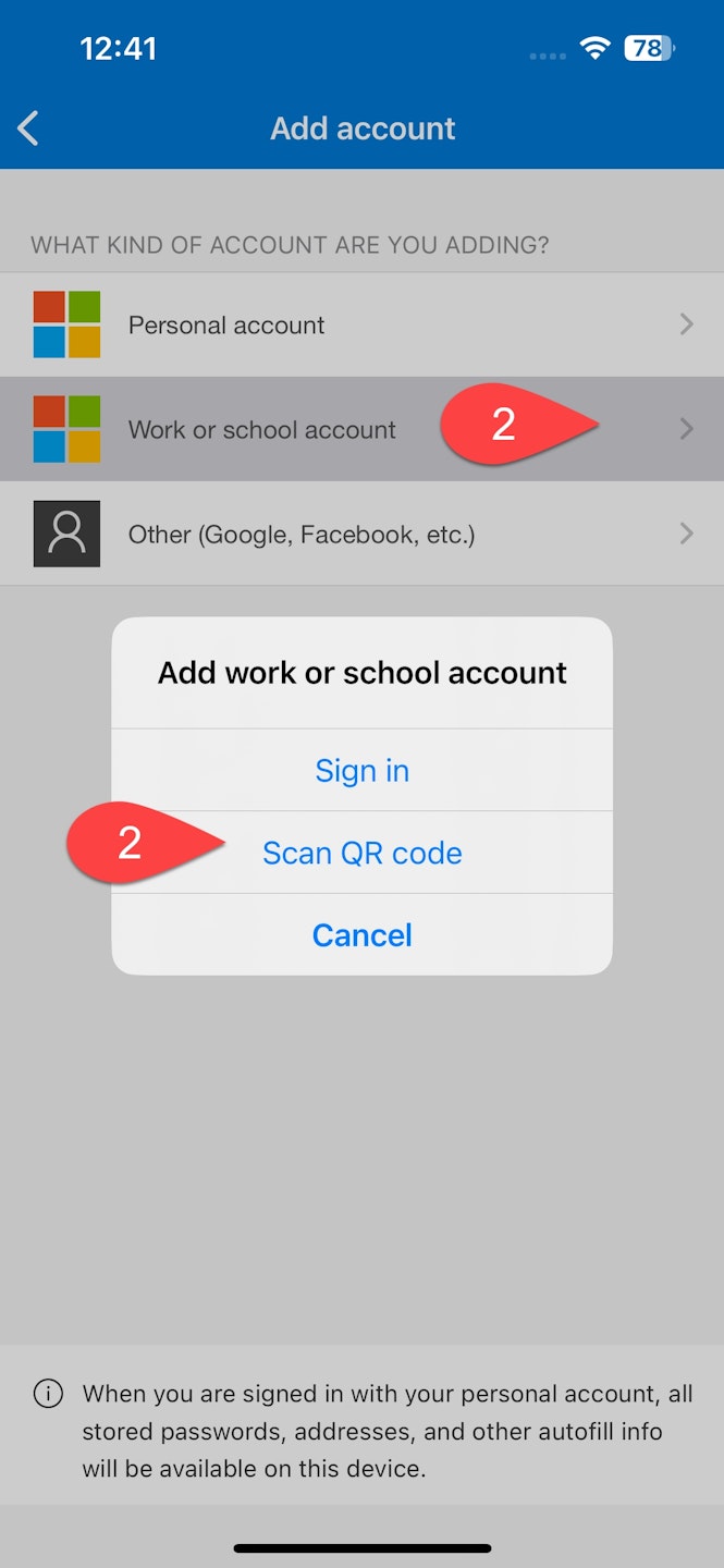 Tap on Work or School, then on Scan QR Code.