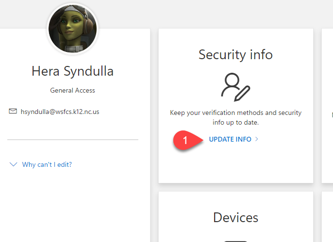 On your My Account page, click on UPDATE INFO in the Security Info pane. Sign in and complete any existing MFA method when prompted.