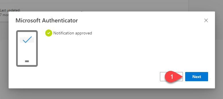 In the Microsoft Authenticator pane in your web browser, it will say Notification approved. Click Next.