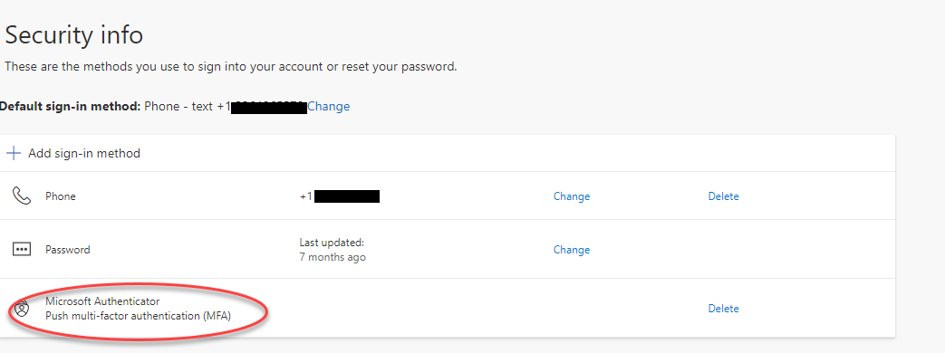 In the Security Info pane in your web browser, you will now see the Microsoft Authenticator app as an MFA method.