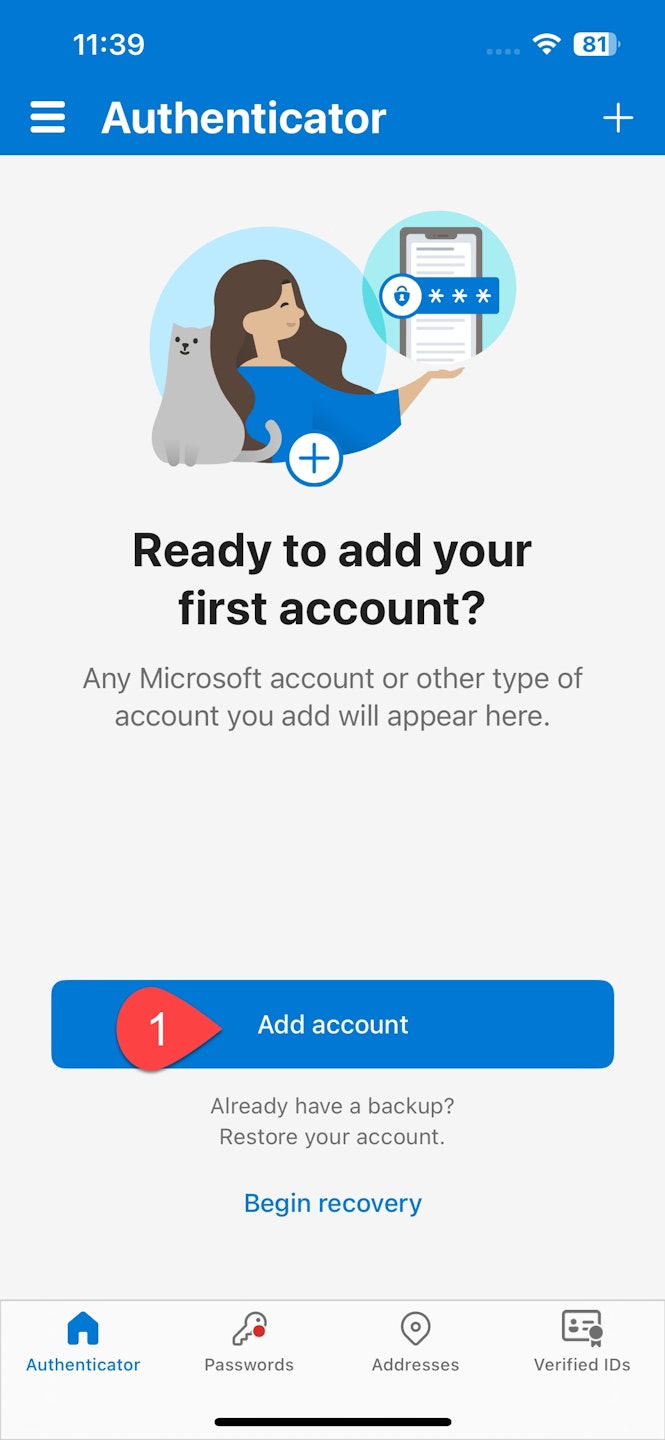 In the Authenticator app on your phone, tap on Add Account.