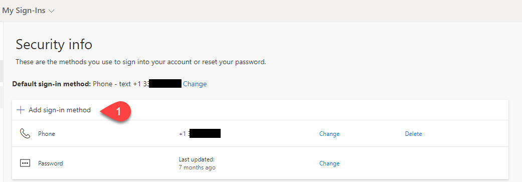 In the Security Info pane on your My Sign-Ins page, click on Add sign-in method.
