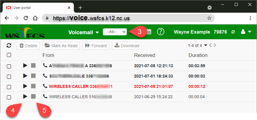 Checkboxes to the far left of each voicemail allow you to select more than one and then use the top Delete, Mark As Read (old), Forward and Download buttons.