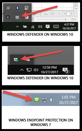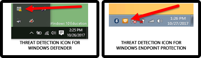 When a threat is detected you will receive a popup message indicating the threat and what Defender or Endpoint Protection is doing with that threat. After a threat has been detected your icons will change to reflect something needs to be done for remediation.
